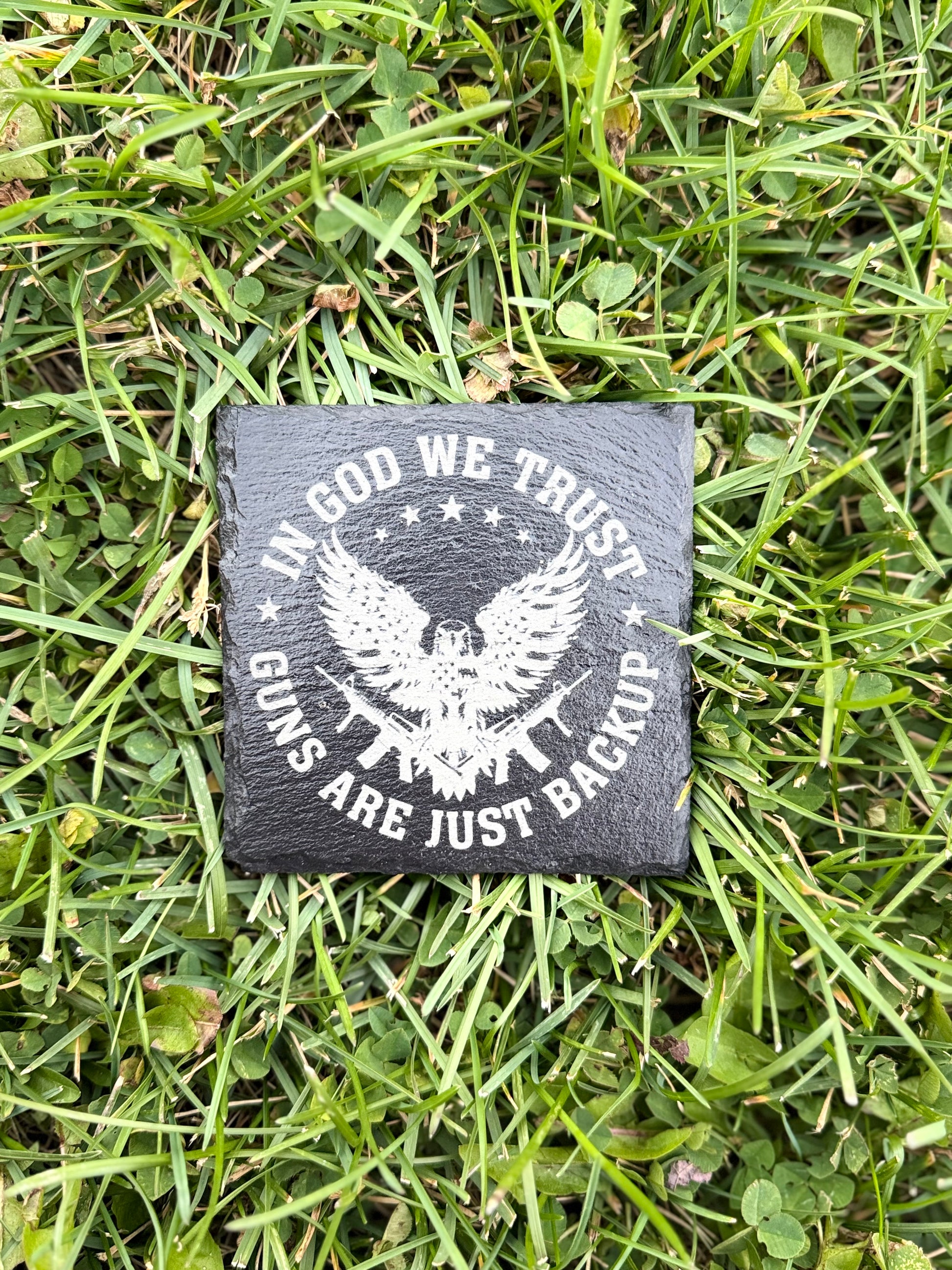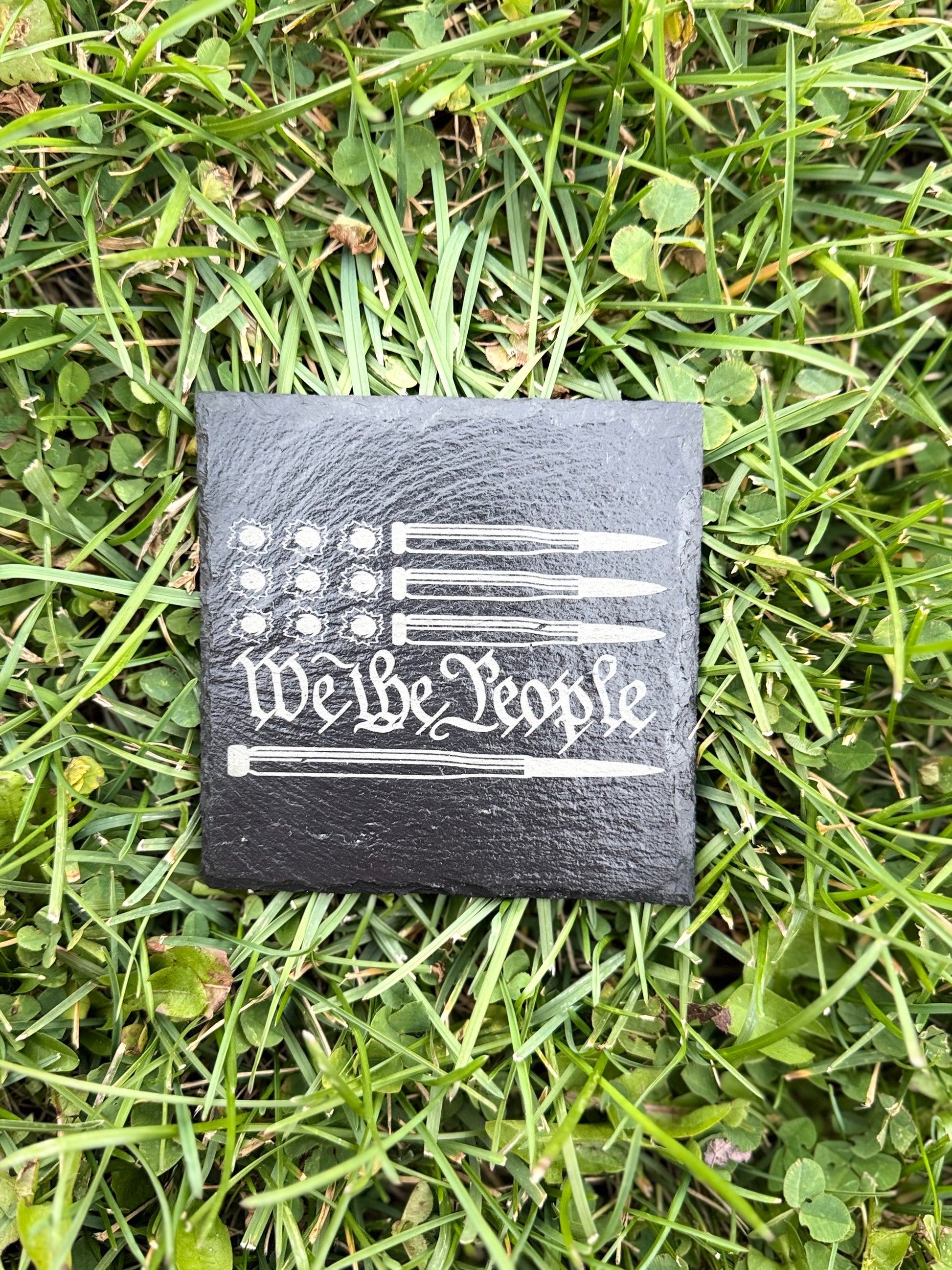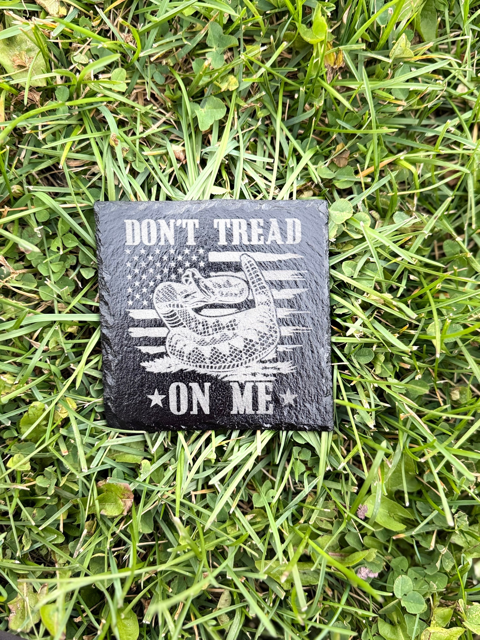Show your patriotism and protect your tabletops with this ruggedย set of four 4-inch natural slate coasters. Each coaster is laser-engraved with bold Donโt Tread on Me and firearm-inspired designs that stand out beautifully against the dark slate surface.